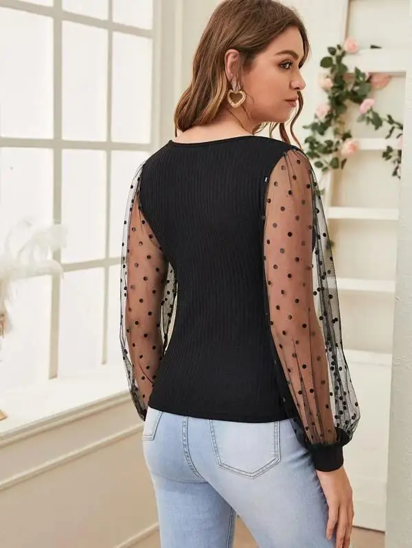 Best Offer 2020 spring net yarn splicing long sleeve T-shirt v-neck casual polka dot mesh women tops black tee shirts