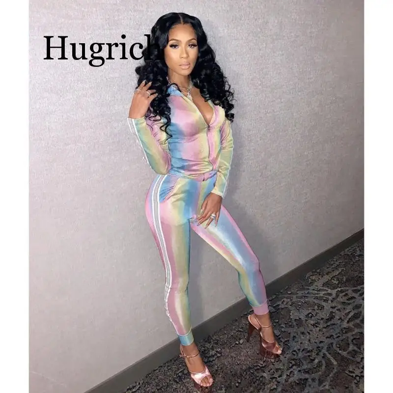 Best Offer 2020 Winter Women Sets Full Sleeve Tops + Pants Suits Rainbow Striped Print Two Piece Set Casual Streetwear Fitness Tracksuits