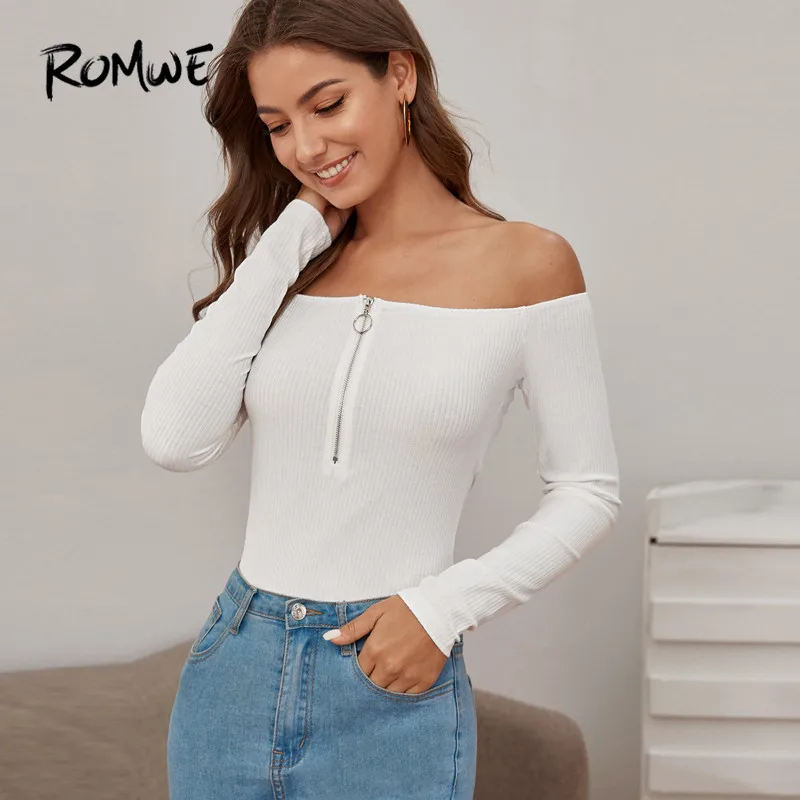 Buy ROMWE O-Ring Zip Front Off Shoulder Top Basic Fitted Long Sleeve Shirt Women Half Placket Black Tshirt Slim Fit Ladies Tops