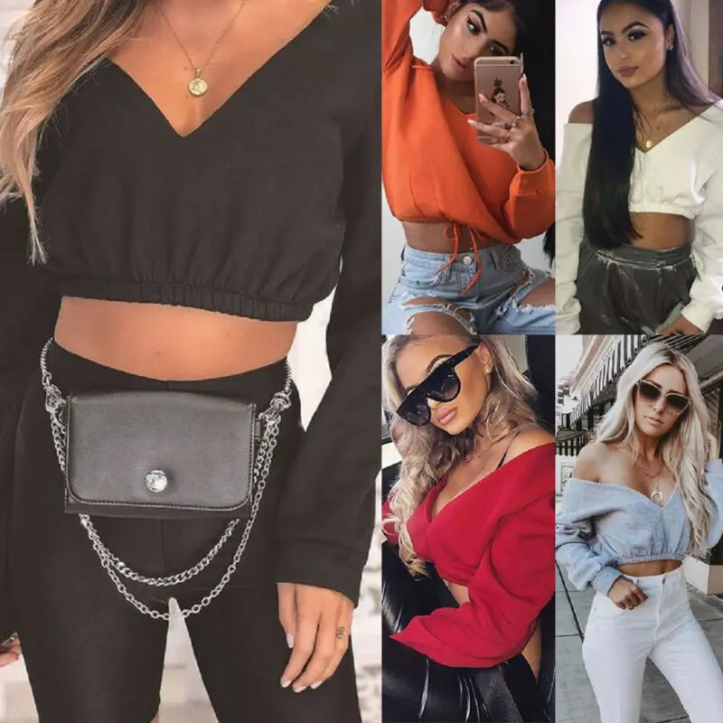 New Women Long Sleeve Deep-V Neck Top Off Shoulder Shirt Casual Tops Solid T-Shirt Tops Fashion Autumn Clothes