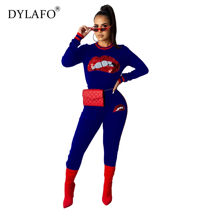Buy Sequins Big Lips Print Casual 2 Piece Suits Long Sleeve O Neck Top+Leggings Pants Autumn Sets Women Clothes Plus Size Tracksuits