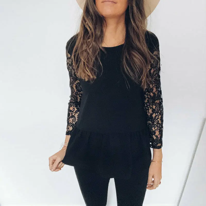 Promo US 2020 New Ship Women Lace Casual Long Sleeve Loose Fit Tunic Tops Lady Sport Outwork T-Shirt Soft Outwear Blouse Black S-XL