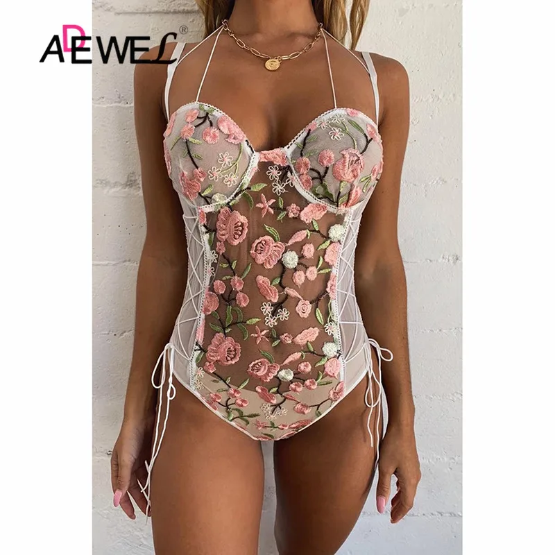 Promo ADEWEL White Transparent Spaghetti Straps Floral Lace Bodysuit Women Print Mesh Bodysuit Sexy Sheer Body Suit Backless Rompers