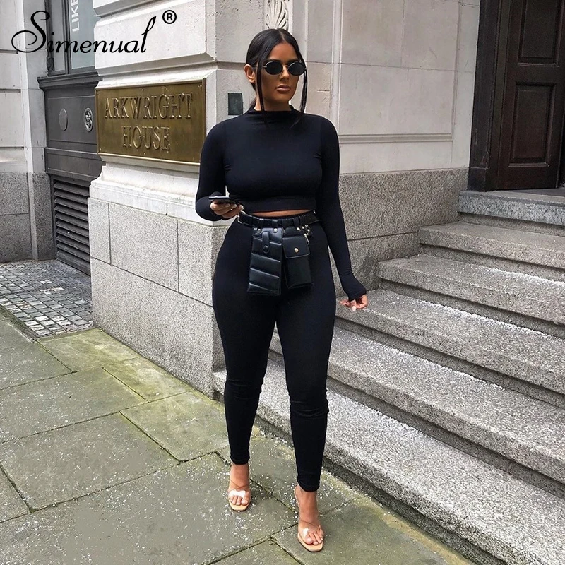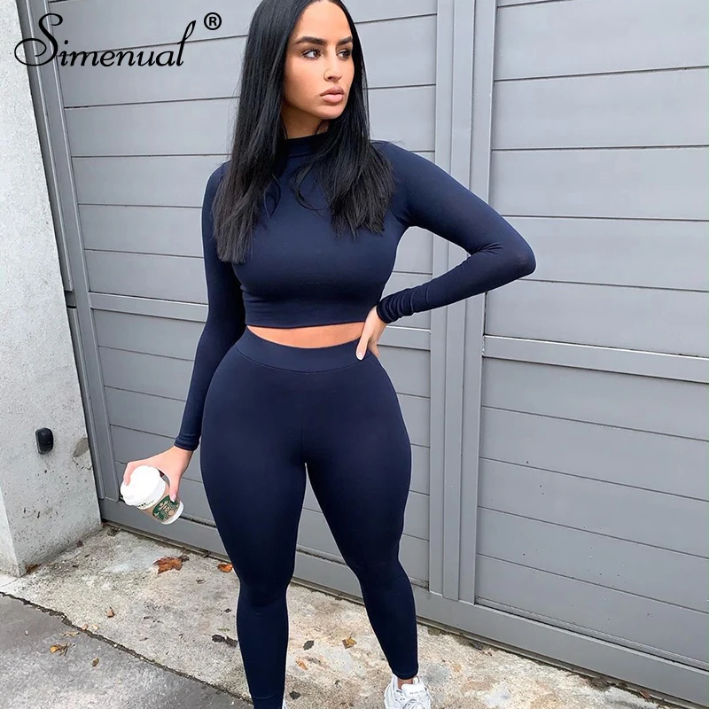 New Simenual Basic Solid Skinny Women Two Piece Set Casual Fashion Workout Active Wear Bodycon Outfits Long Sleeve Top And Pants Set