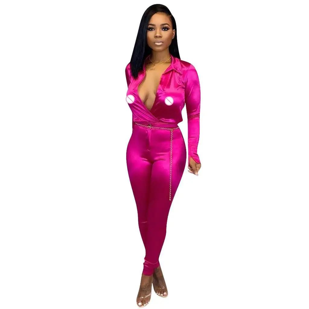 Sale Turn Down Collar Top High Waist Pants Suit Two Piece Sets Women Solid Satin Suit Tracksuit Bodycon Plus Size Outfits