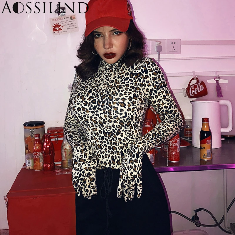 Promo AOSSILIND Sexy Leopard Turtleneck Skinny Bodysuits With Gloves Women Autumn Long Sleeve Rompers Night Club Stretchy Bodysuit