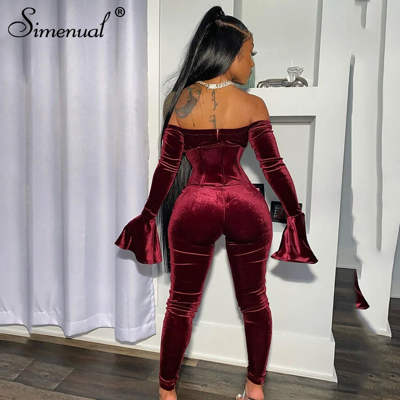 Best Offer Simenual Velvet Lace Up Flare Long Sleeve Rompers Womens Jumpsuit Fashion Off Shoulder Sexy Party Jumpsuits with Corset Clubwear