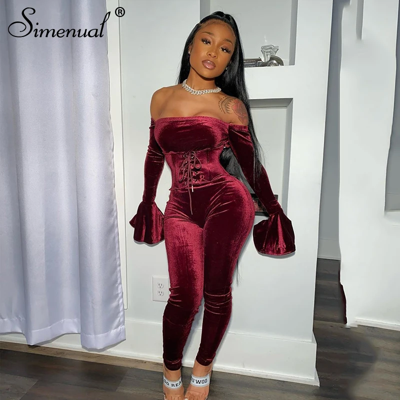 Promo Simenual Velvet Lace Up Flare Long Sleeve Rompers Womens Jumpsuit Fashion Off Shoulder Sexy Party Jumpsuits with Corset Clubwear