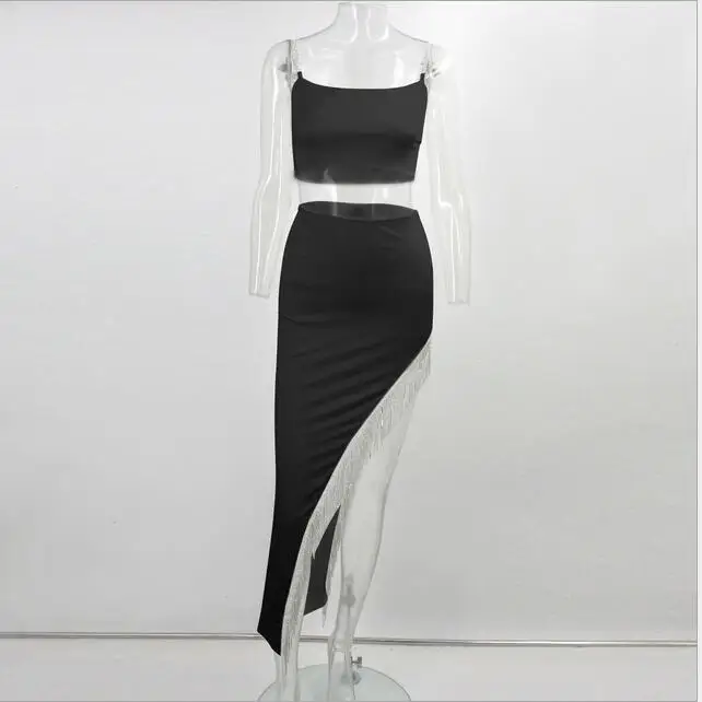 Sale dangcing tank top Sexy Two Piece Set Solid Tassel Autumn White Party Women Spaghetti Strap High Split Women Two Piece Outfit