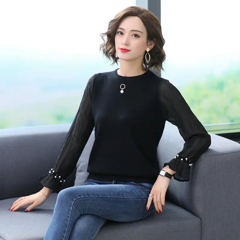 Sale Woman Spring Knitted Tops Beaded Ruffle Long Sleeve Patchwork Knitwear Female White Black Khaki Chic O Neck Pullover Sweater New