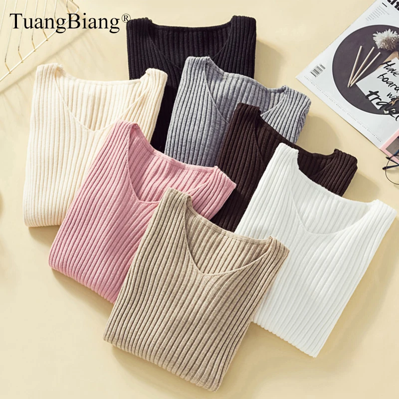 Promo Women V-Neck Long Sleeve stripe Coffee Sweater 2019 Knit feminine Basic elasticity Pullovers Autumn Ladies Winter apricot Jumper