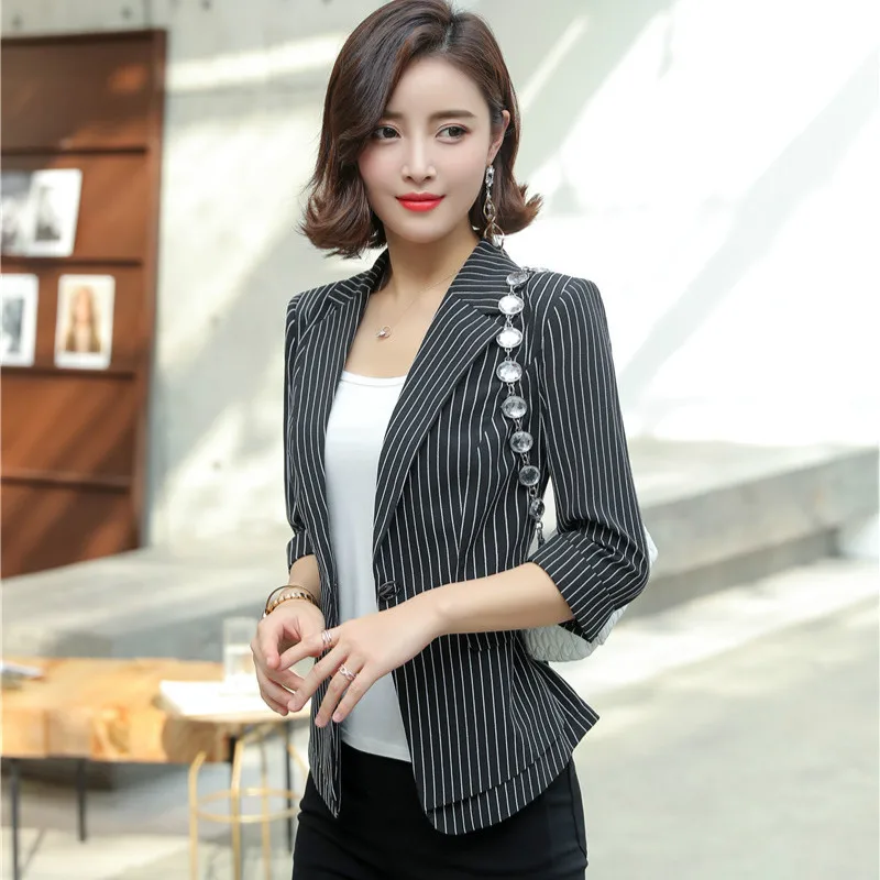 New Spring Summer Fashion Casual Ladies Blazers and Jackets Half Sleeve Dark Grey Striped Female Elegant Formal Office Tops and Coat
