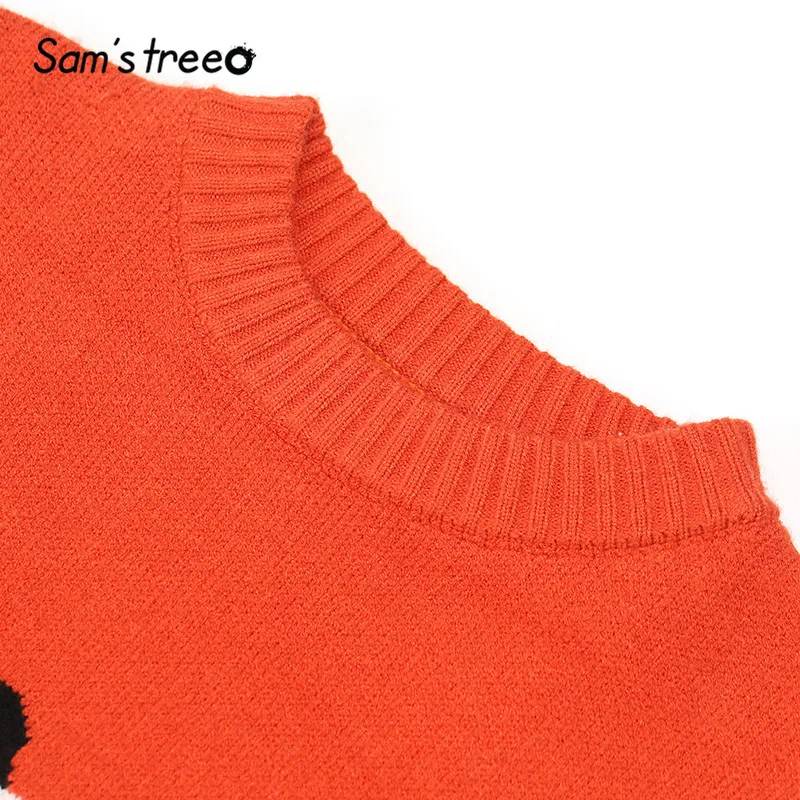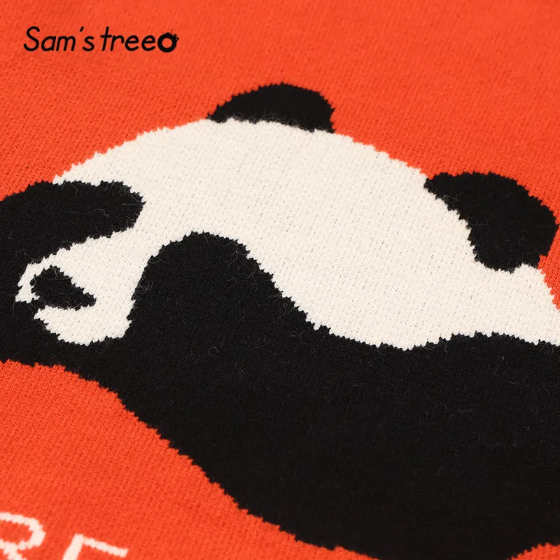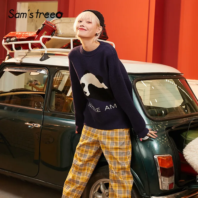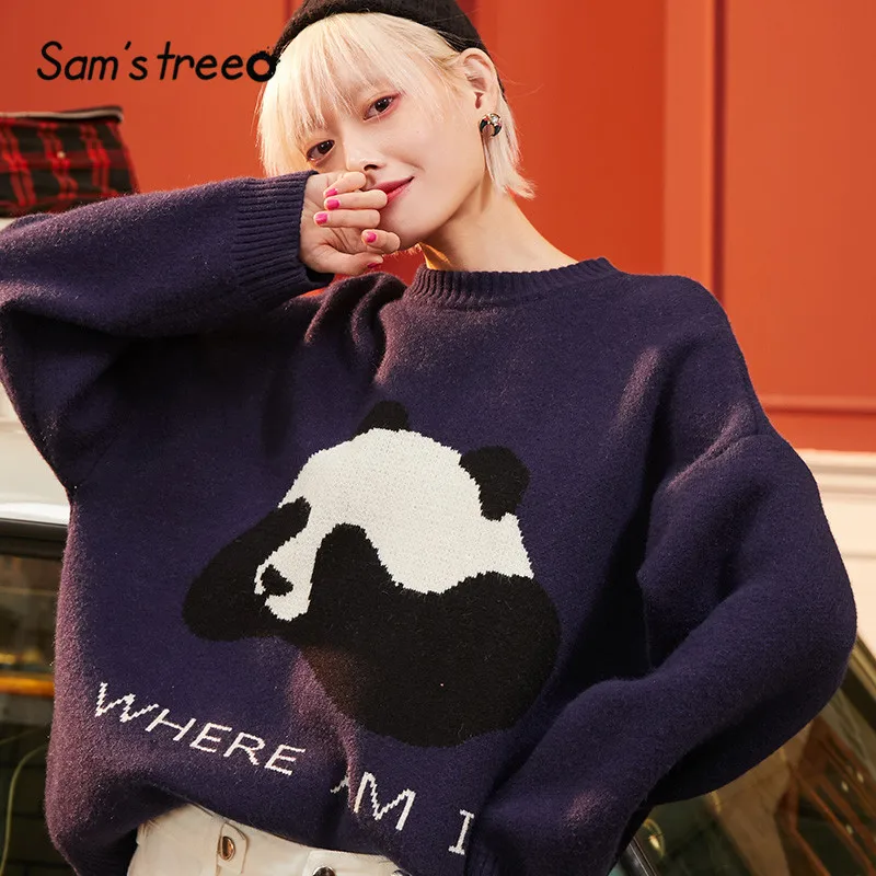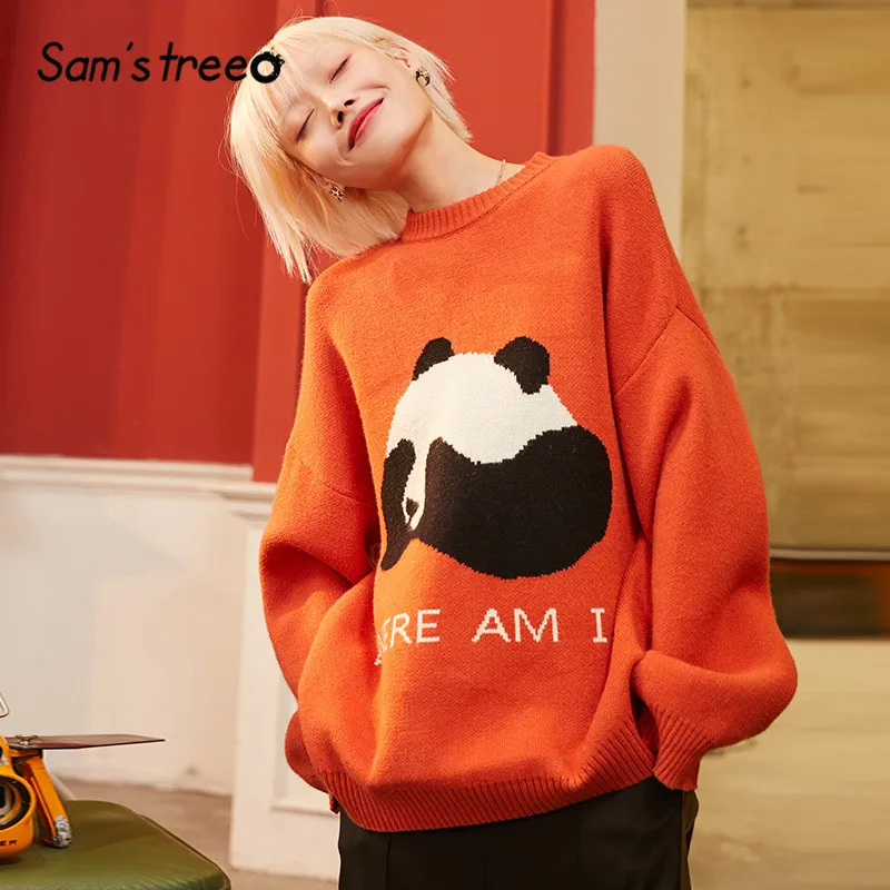 New SAM'S TREE Orange Solid Panda Print Korean Knit Pullovers Women Sweaters 2020 Winter Navy Blue Pure Loose Downy Cute Female Top