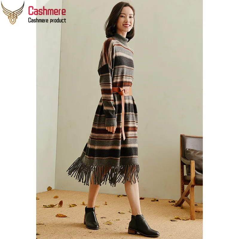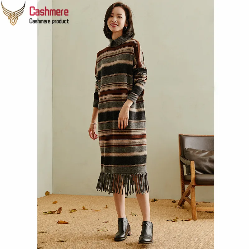 Sale High-end 100% pure cashmere sweater dress women autumn winter new thick stripe color matching lazy wind fringe sweater dress