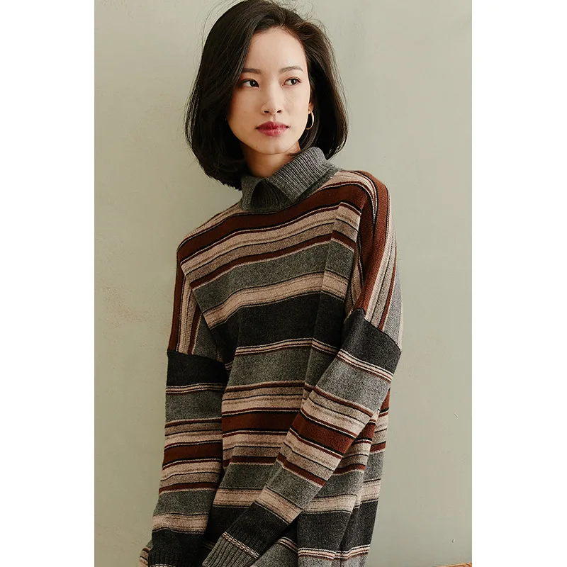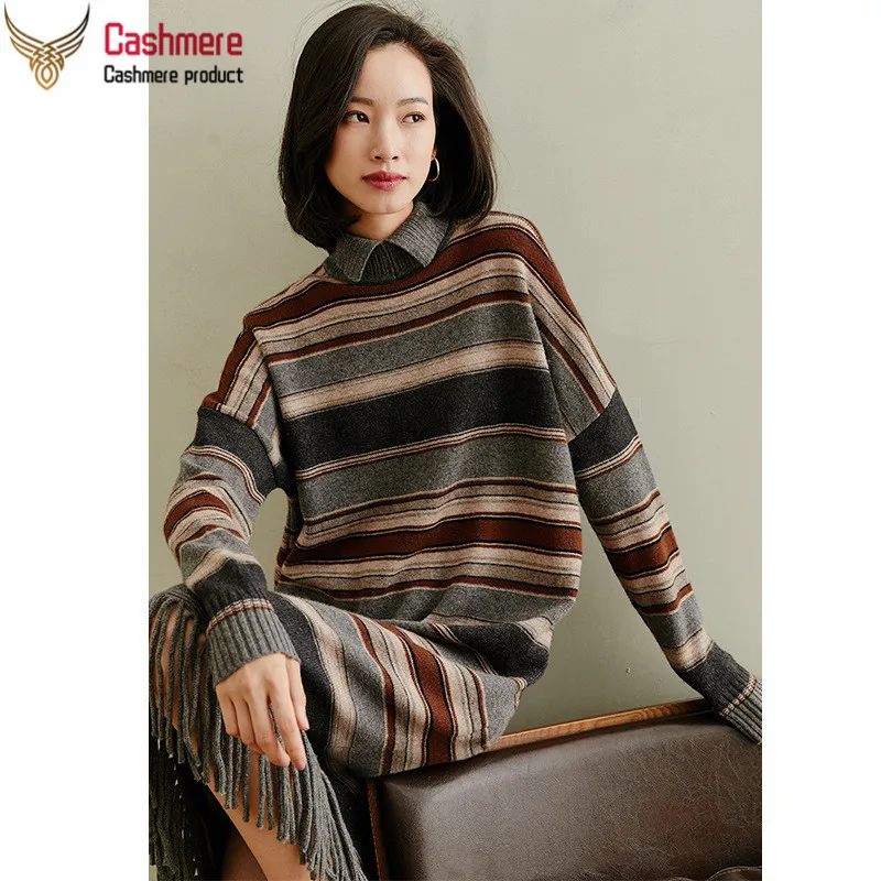 New High-end 100% pure cashmere sweater dress women autumn winter new thick stripe color matching lazy wind fringe sweater dress