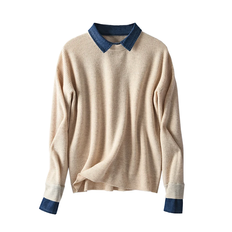 Sale Wool Patchwork Denim Womens New Arrival Sweaters Turn-down Collar Casual Women Tops Winter 2019 Fashion Pullover knitted