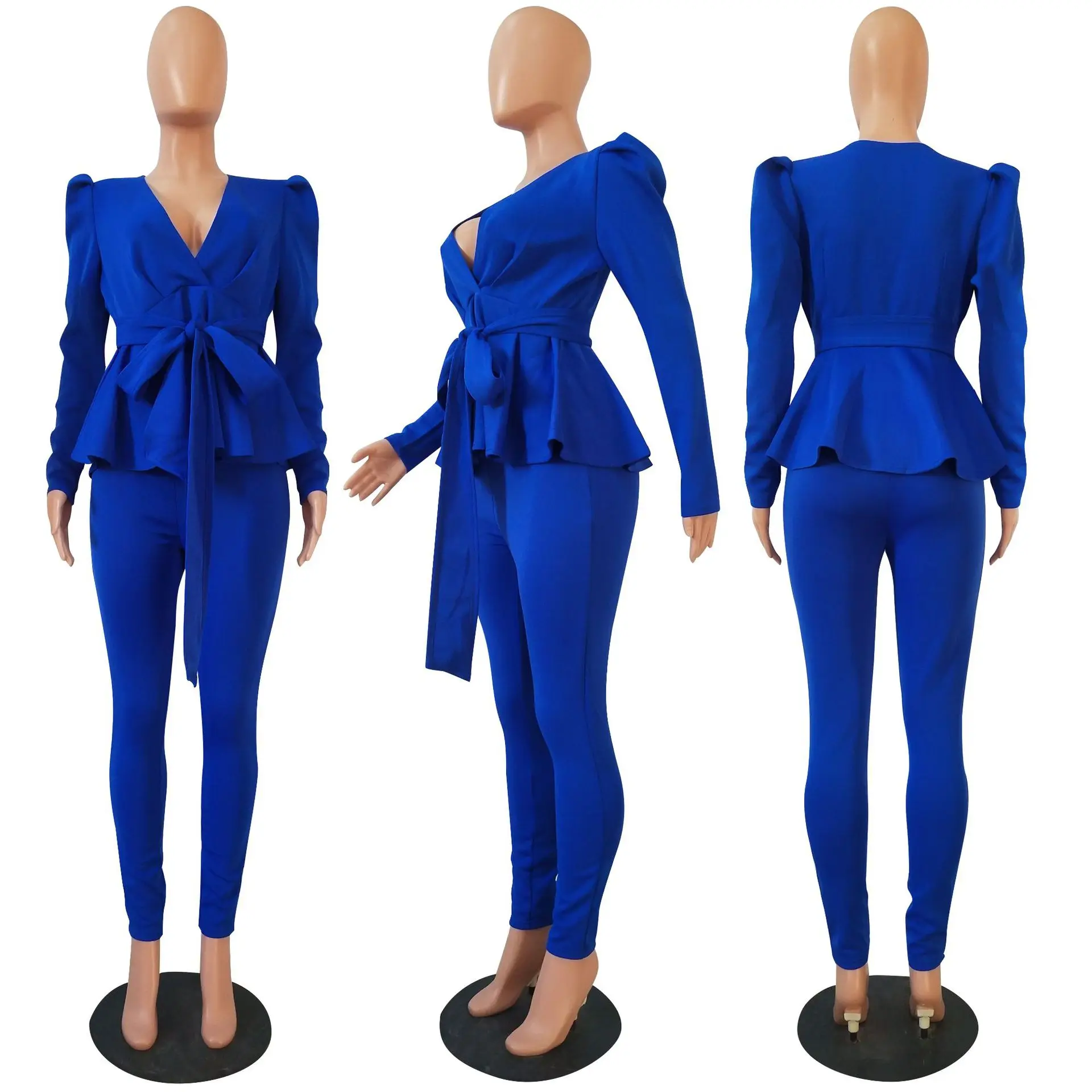 Best Offer Solid Women Blazer Two Piece Set Casual V Neck Long Sleeve Ruffle Hem Blazer Coat Jacket Top Long Pants Suit Office Lady OL Set