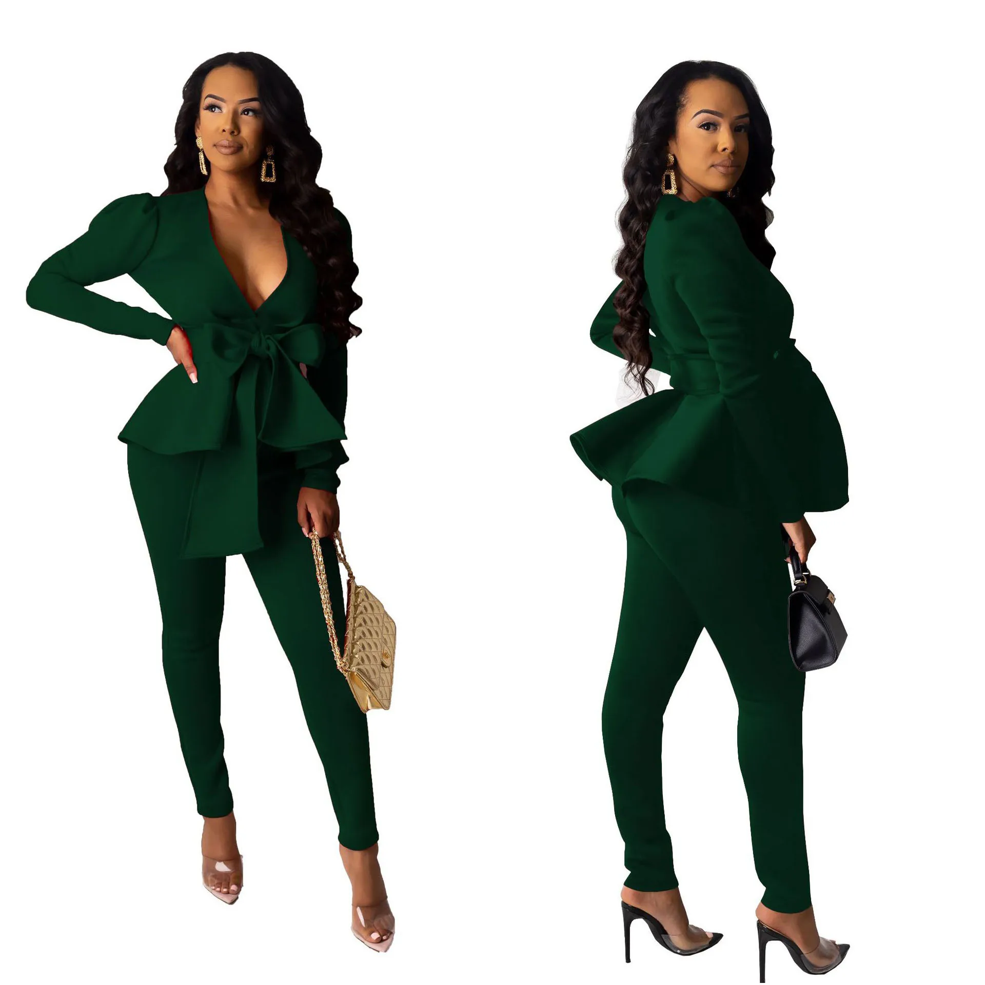 Promo Solid Women Blazer Two Piece Set Casual V Neck Long Sleeve Ruffle Hem Blazer Coat Jacket Top Long Pants Suit Office Lady OL Set
