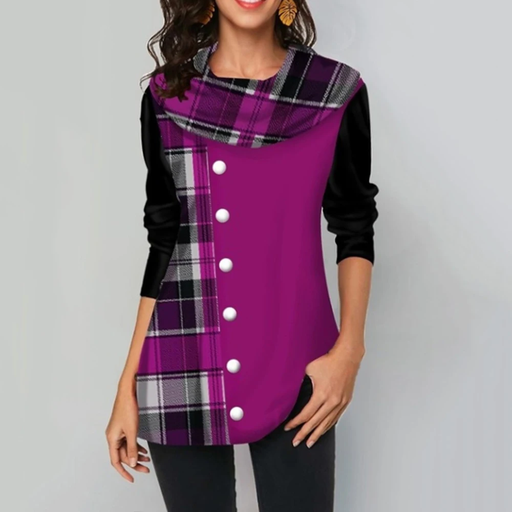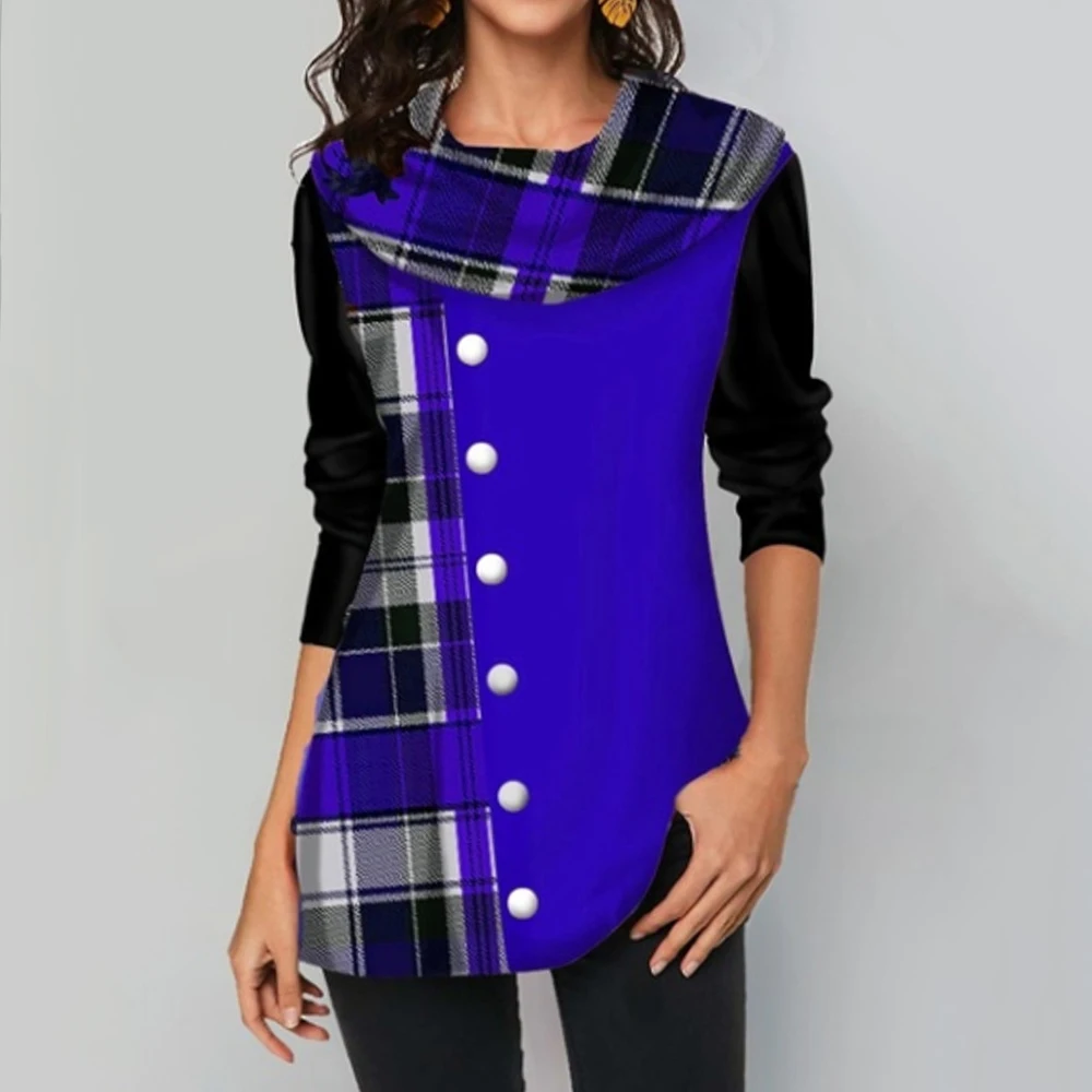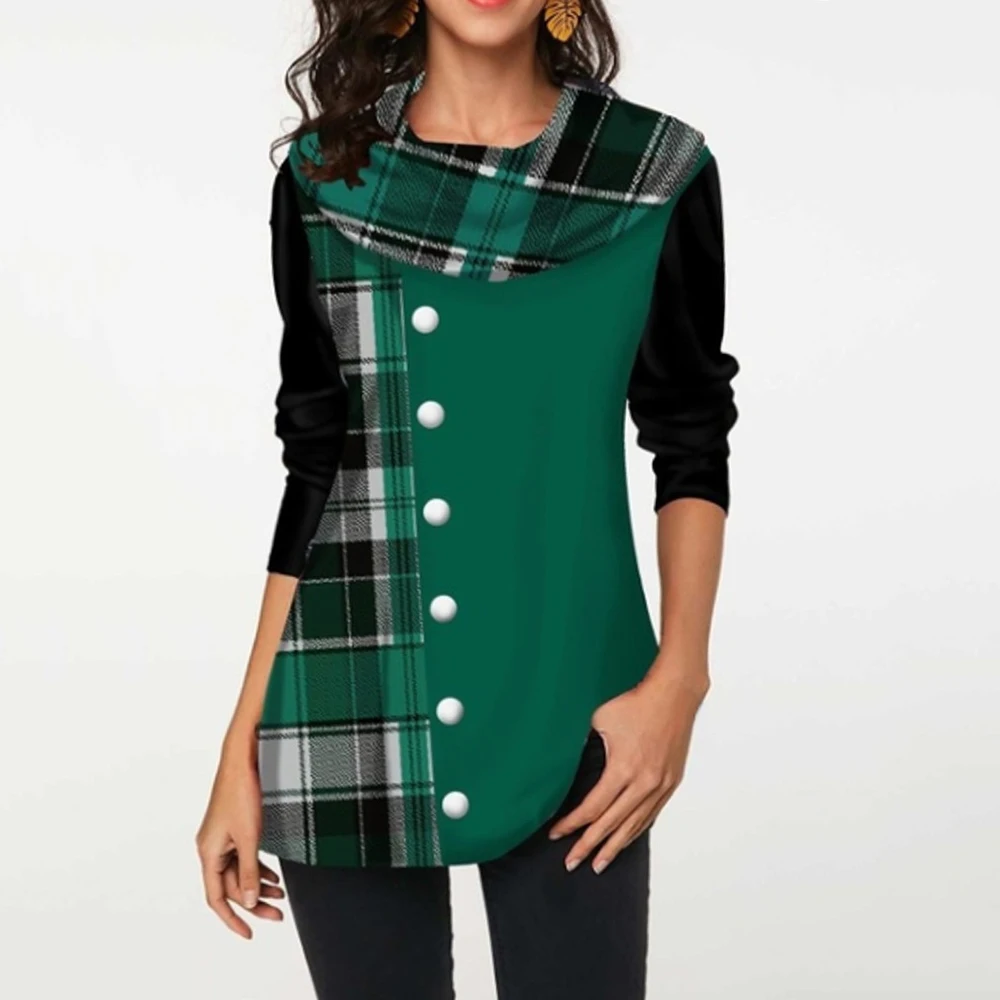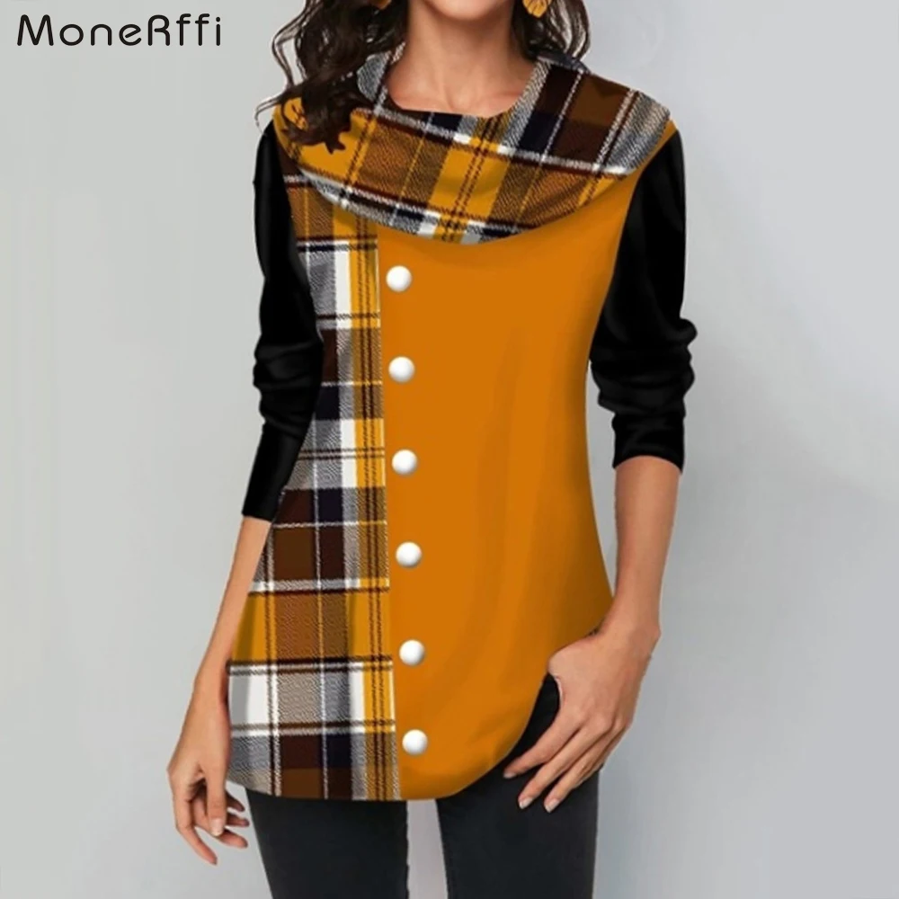 Sale MoneRffi Winter Blouse Women Long Sleeve Tartan Tunic Sweatshirt Button Clothing Plaid Turtleneck Female Pullover Tops New 2020