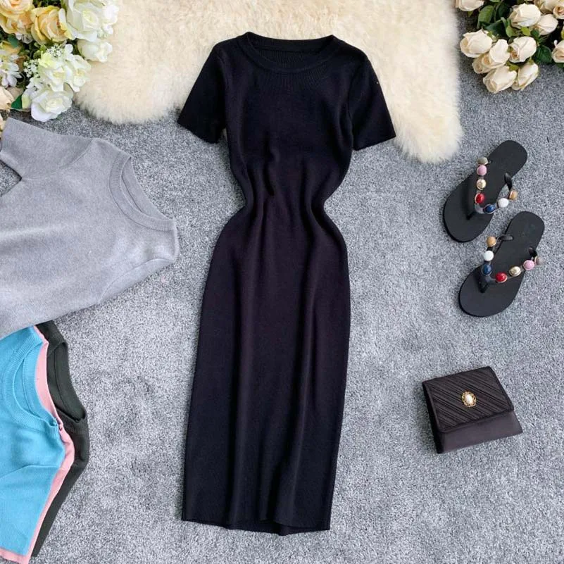 Buy 2019 new fashion women's dresses Solid color simple round neck short sleeve elastic knit tight bag hip dress Euro-American simpl