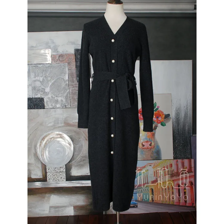 New YUNINYOYO French elegant pearl button extra long lace up wool and cashmere blend women autumn winter long cardigan ~ excellent