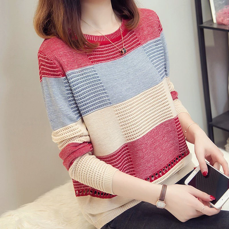 Best Offer Early Autumn Women Dress Korean Casual Style Mixed Colors Loose Fit Stripe Long Sleeve Base Shirt Sweater Pullove New Style