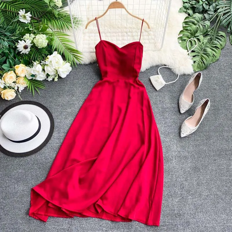 Sale 2019 Women Sleeveless Spaghetti Strap Dress Casual V Neck Back Cross Strap Beach Dress Elegant High Waist Party Dress