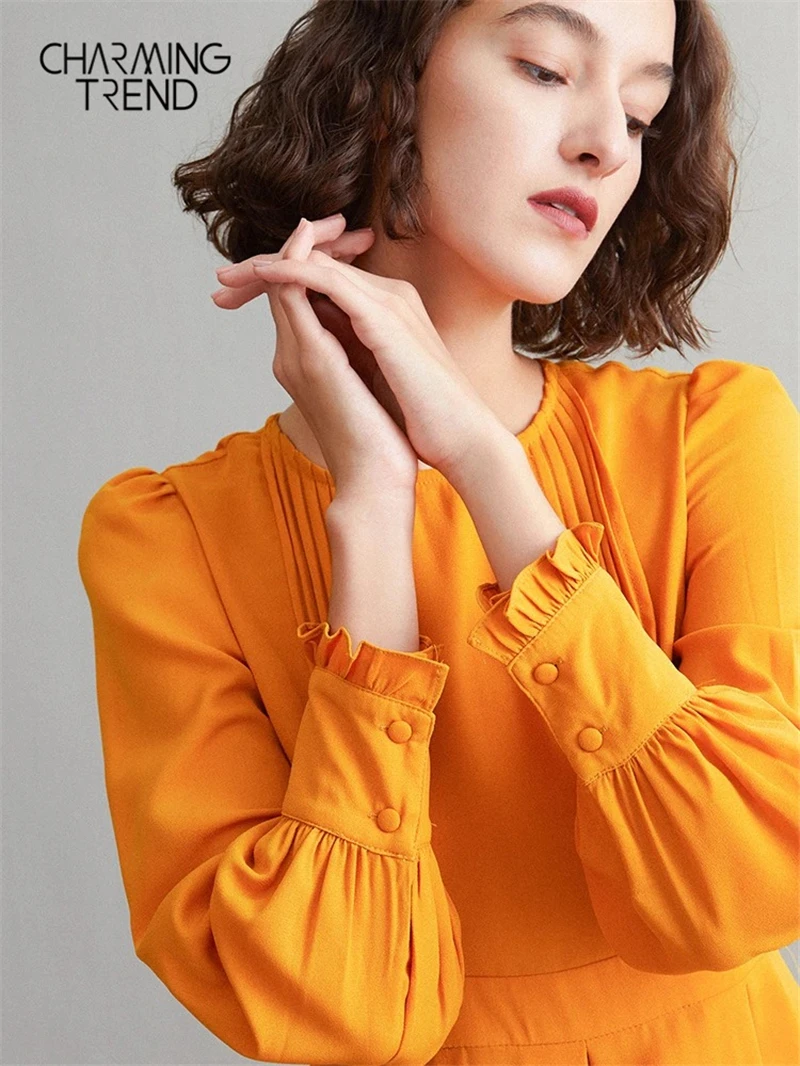 Sale 2020 New Elegant Women ?s Long Dress Long Puff Sleeves High Waist Round Neck Women Dress fit office party dresses Yellow
