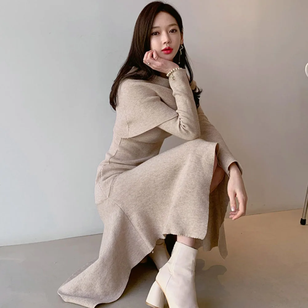 Sale Off Shouler Sweater Dress Women 2020 Korean New Elegant Knitted A Line Mid Calf Long Dresses Girl's Cusal Solid Party Vestidos